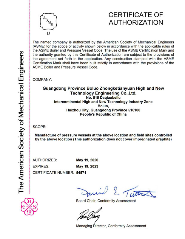 中科天元全資子公司廣東省博羅中科天元高新技術工程有限公司(以下簡稱“博羅中科天元”)分別在2020年8月17日~18日進行了ASME許可(U鋼印)換證復審工作、在2020年9月16日~18日進行了壓力容器制造(D級)及壓力管道安裝(GC2級)換證復審工作,并于近日獲得通過。