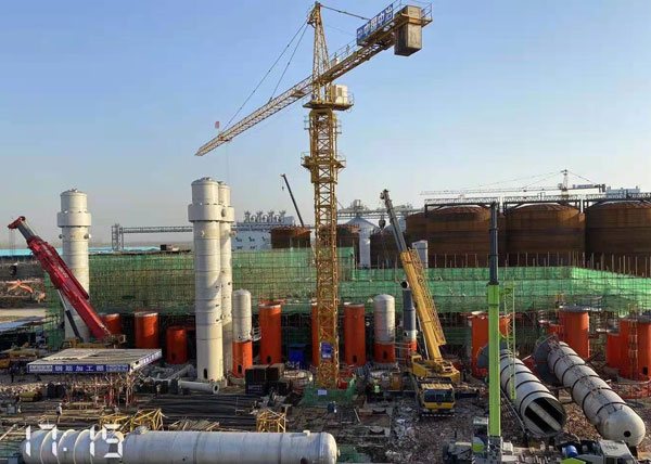 此次設備吊裝最大高度20米,吊裝重量50噸左右,選用200噸汽車吊,因受場地、道路條件、各單位交叉作業等諸多因素限制,吊裝作業異常復雜。項目部對此高度重視,在前期就做了大量準備工作,不但反復勘察地形和施工條件,模擬并討論吊裝方案,還與業主單位、總包單位、有關施工單位進行了多次溝通與協調,才最終確定了最優吊裝方案,確保了本次吊裝工作順利完成。