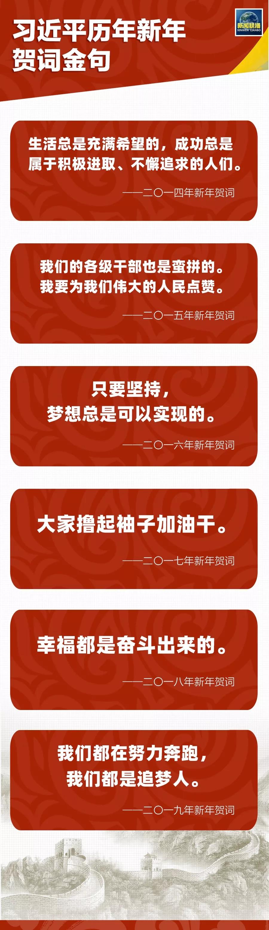 回顧習(xí)主席已經(jīng)發(fā)表的6篇新年賀詞,我們發(fā)現(xiàn),這些講話(huà)言簡(jiǎn)意賅、短小精悍卻又內(nèi)涵豐富、亮點(diǎn)紛呈。