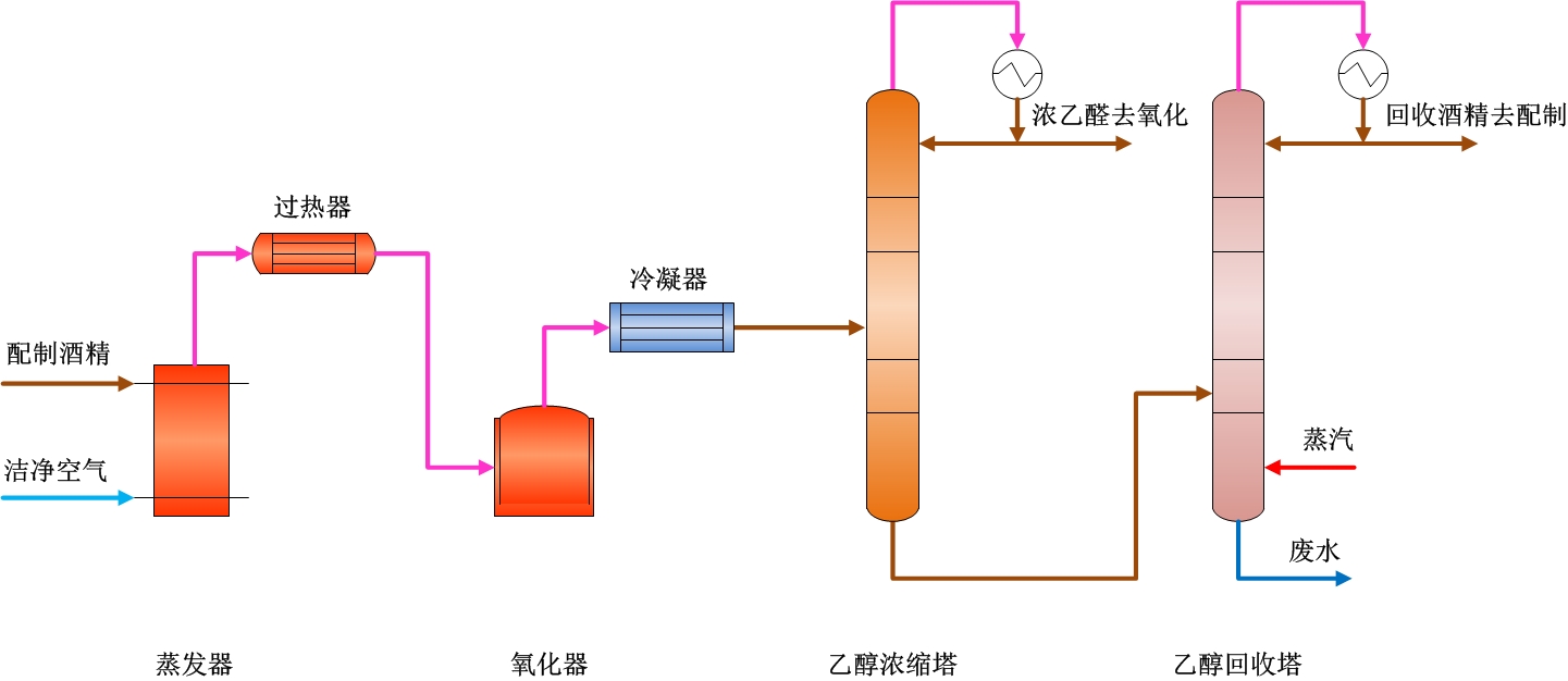 配制好的酒精送入蒸發(fā)器蒸發(fā),同時加入空氣,出蒸發(fā)器的氣相混合物經(jīng)過熱后進入氧化器,在催化銀的作用下,乙醇轉(zhuǎn)化為乙醛,乙醛冷凝后進入乙醛濃縮塔,濃縮后的濃乙醛去乙醛氧化工序使用,未反應的乙醇通過回收塔回收返回乙醇配制間。