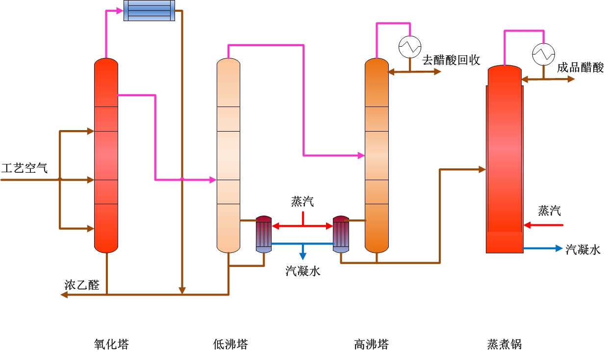 濃乙醛自塔底送入氧化塔,同時加入醋酸錳,氧化塔分為五段,每段均通入空氣,在氧化塔內(nèi),乙醛被氧化成醋酸,塔頂未反應氣體進冷凝器,冷凝液回氧化塔底,不凝氣排放,粗醋酸送入低沸器。在低沸塔內(nèi),醋酸錳被分離下來,送回氧化塔,塔頂醋酸蒸汽自塔中部進入高沸塔。乙酸甲酯等低沸物在高沸塔內(nèi)上升至塔頂,冷凝后部分采出的稀酸送入蒸發(fā)鍋。在蒸發(fā)鍋內(nèi),醋酸被蒸發(fā)自塔頂,冷凝、冷卻后即得到成品醋酸,塔釜少量高沸物定期清理。