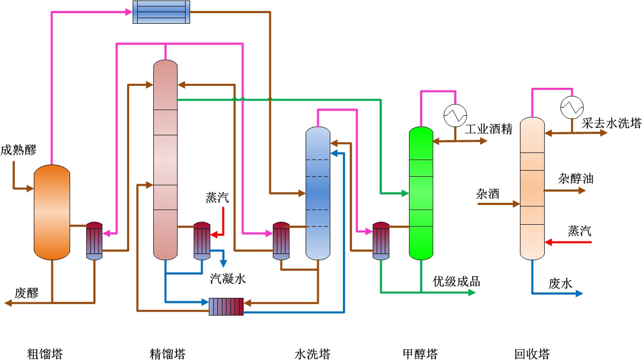 配置粗餾塔、水洗塔、精餾塔、甲醇塔、回收塔,其中精餾塔采用蒸汽供汽,精餾塔塔頂酒汽供熱粗餾塔和水洗塔,水洗塔塔頂酒汽供熱甲醇塔,粗餾塔和回收塔塔頂酒汽預熱成熟醪。